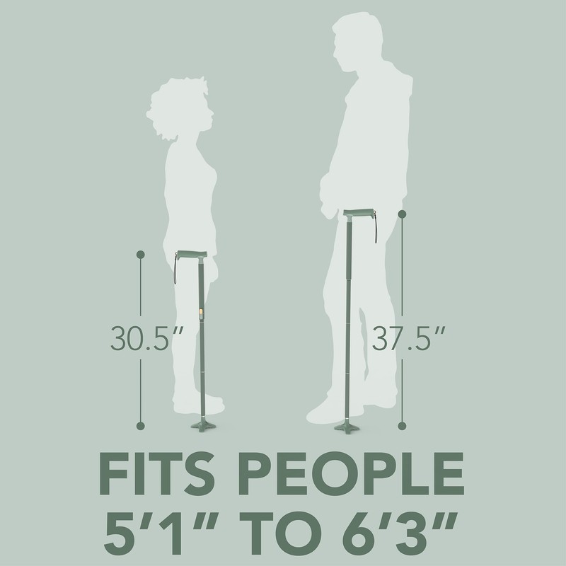 - SIMPLE ADJUSTMENTS - No more pesky, painful push pins. The Quick Fold foldable cane is simple to adjust - simply press, slide, and set. Our walking canes are suitable for heights ranging between 5' 1" and 6' 3" - walking cane length 30.5" to 37.5".