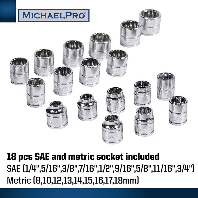 - 【Socket Set】This includes sockets in both SAE (1/4",5/16",3/8",7/16",1/2",9/16",5/8",11/16",3/4") & Metric (8,10,12,13,14,15,16,17,18mm), a standard 12-point socket and a 3” extension bar.