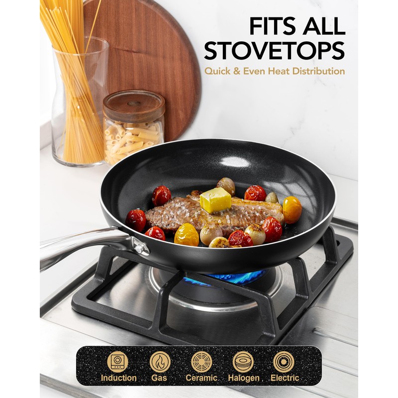 • All-Cooktop Compatibility - Our non stick pan can be used on all cooktops, including gas, electric, induction, and glass. Experience effortless cooking convenience on any cooktop types.