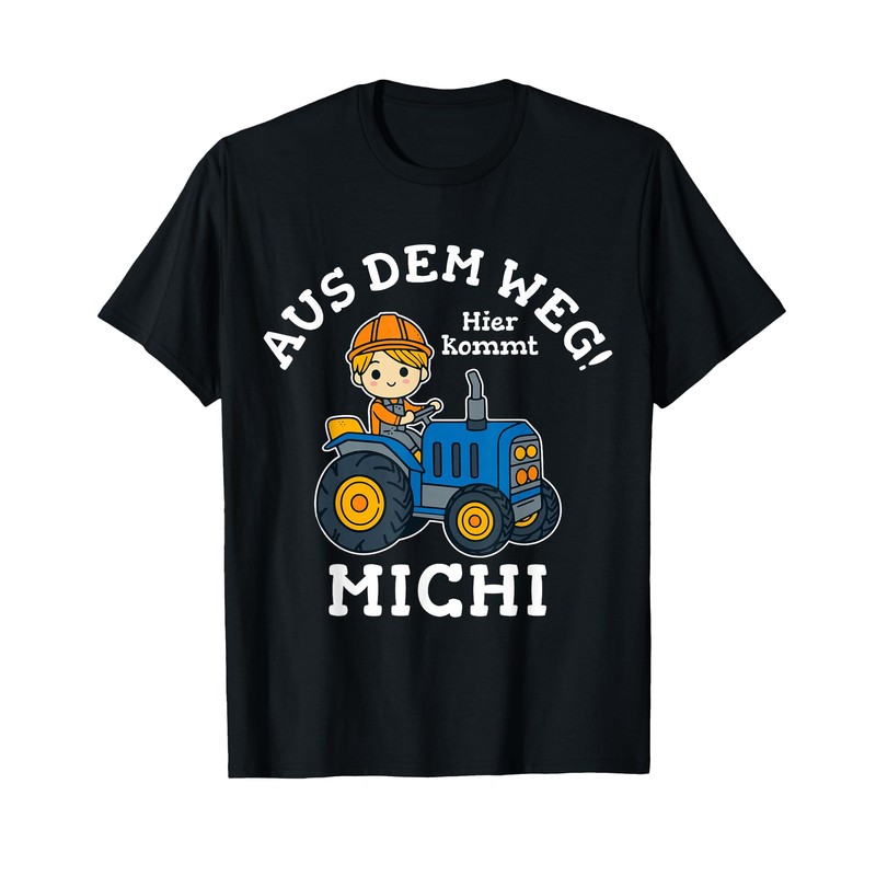 - A cute tractor motif: boy with construction helmet on blue tractor and funny saying: "Aus dem Weg hier kommt Michi! Personalised with the pet name of Michael. This cool fun tractor design makes every farmer and tractor fan heart beat faster