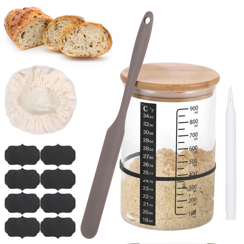 - đăComplete Sourdough Starter Jar KităOur all-inclusive sour dough starter kits contains everything for effortless fermentation: 900ml fermentation jar, temperature indicator strip, rubber bands, marker pen, 8 labels, silicone spatula, fabric-lined lid, and wooden lid. Everything you need to create perfect sourdough with convenience.