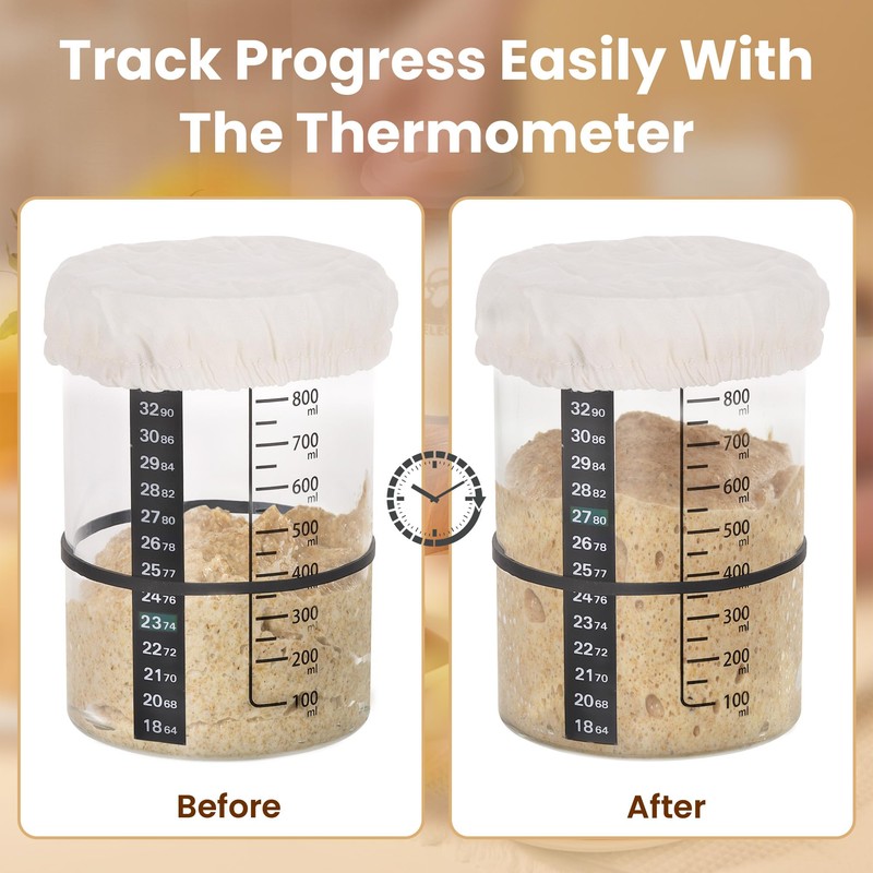 - đăSmart Baking CompanionăThe sourdough starter jar features an integrated temperature strip for precise fermentation control. Perfect for both novice bakers and seasoned artisans - monitor your culture's progress at a glance.