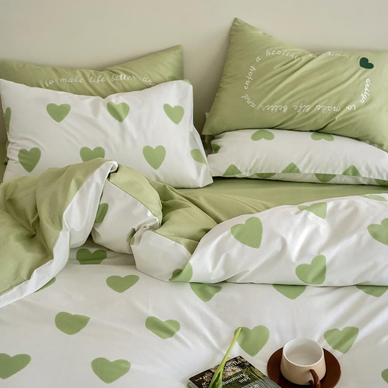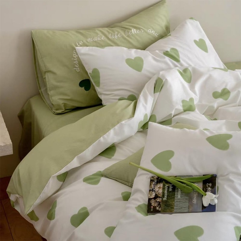 Aesthetic white with green heart bedding set is made of high-quality microfibre, environmentally friendly materials, soft and breathable.