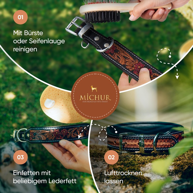 - Michur collars for dogs are handmade from leather, are softly lined and gentle on the fur as we insist on tested leather goods when purchasing the raw materials and insure controlled production process, according to German quality standard. Each individual leather collar is unique, thanks to external influences it contains its true beauty and distinctive patina.