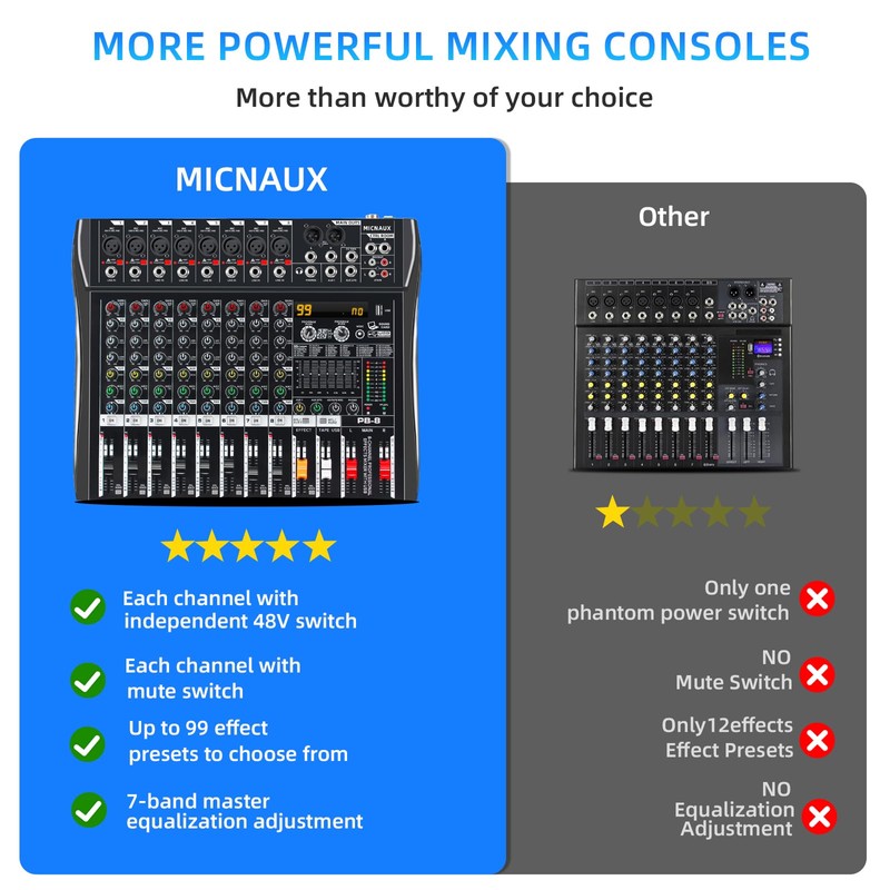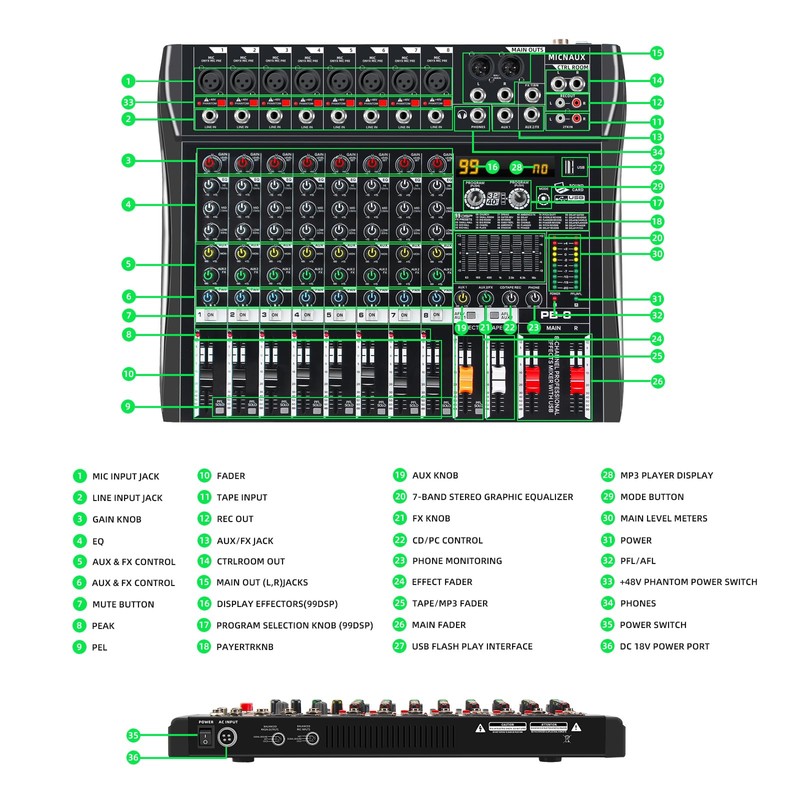 - 【99 DSP Effects】 This professional music mixer features 99 built-in DSP effects, designed for effortless switching to suit any scenario. Ideal for high-quality on-stage performances, live gigs, DJ events, karaoke, and parties, this mixer ensures your sound is always top-notch.