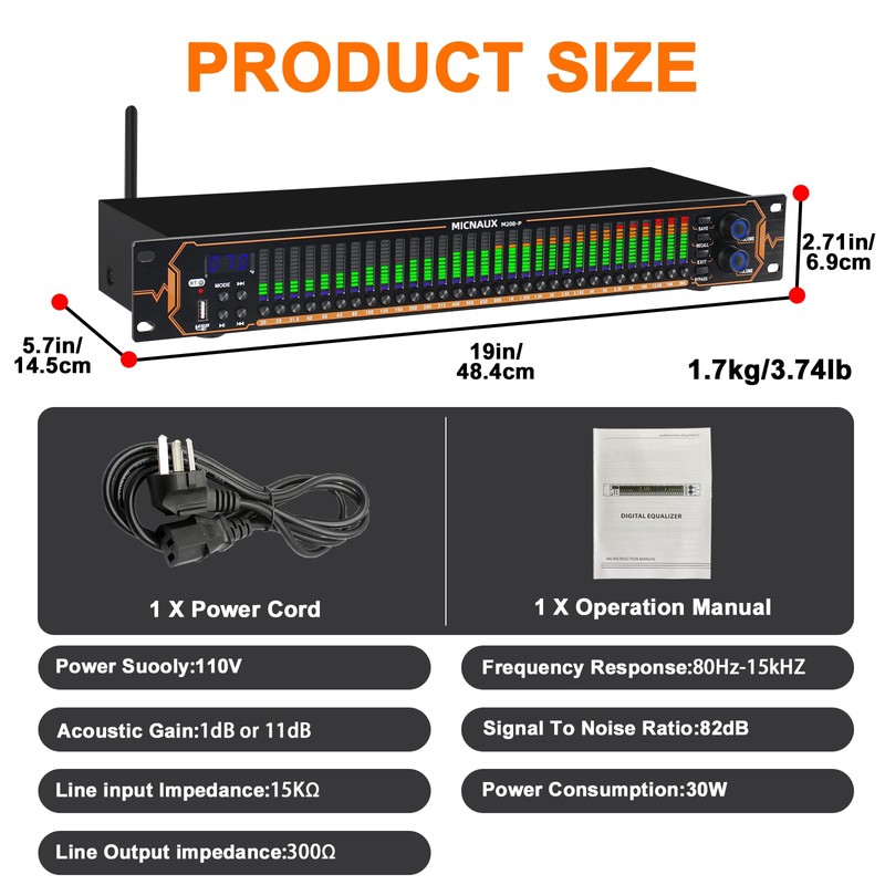 - Precision 31-Band Graphic Equalizer with LED Spectrum Display: Equipped with a professional 31-band DSP equalizer, each band features real-time frequency monitoring. The upgraded 4-color LED lights clearly indicate frequency changes, providing a soft, non-glare glow—ideal for low-light environments and precise sound adjustments.