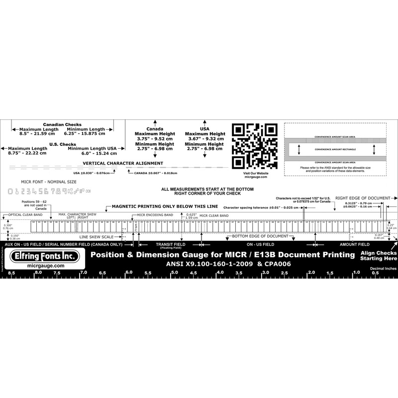 This gauge works for both US and Canadian checks. All U.S. specifications are measured in inches. All Canadian specifications are measured in centimeters (cm). MICR printing is right justified. Most MICR measurements are specified from the bottom right corner of your check. This MICR check position gauge is the easiest and most complete gauge on the market.