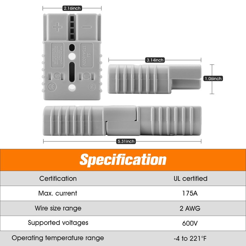 FeaturesConnectors feature a one piece PC housing,Genderless design makes assembly quick and easy and reduces number of parts stock.Using stainless steel springs to hold low resistance contacts in place.Applications BelowUPS battery packs, winches,forklifts;Trolling motor, solar panels, wind generators,tow trucks, snow plows;Farm equipment, jumper booster cables, welding equipment, electric vehicles, fisher plow,etc.How to Use?Just insert the cable into the terminal,then solder or crimp them.SpecificationMaterial:PCGauge:2AwgAMP Rating: AC/DC 175aVoltage Ratings(Volts):600VTerminal Diameter: 0.327inchContact/Terminal Material: silver plated copperMaterial: PC,Fire rating:94-V0Impact Resistance:HighVibration Resistance:ExcellentOperating Temperature Range:-4°F-221°F /-20°C-105°CConnect/disconnect Cycles: 10,000 timesPackage Includes4 x Connectors8 x Terminal4 x Dustproof Rubber Caps2 x HandleNoticeOnly plugs with the same color can be compatible.