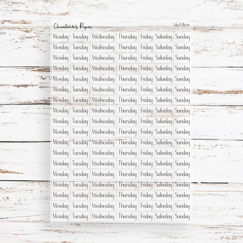 Micro Clear Day of The Week Stickers, 126 stickers .30" tall, 18 weeks, Black Lettering, Modern Functional Planning Stickers