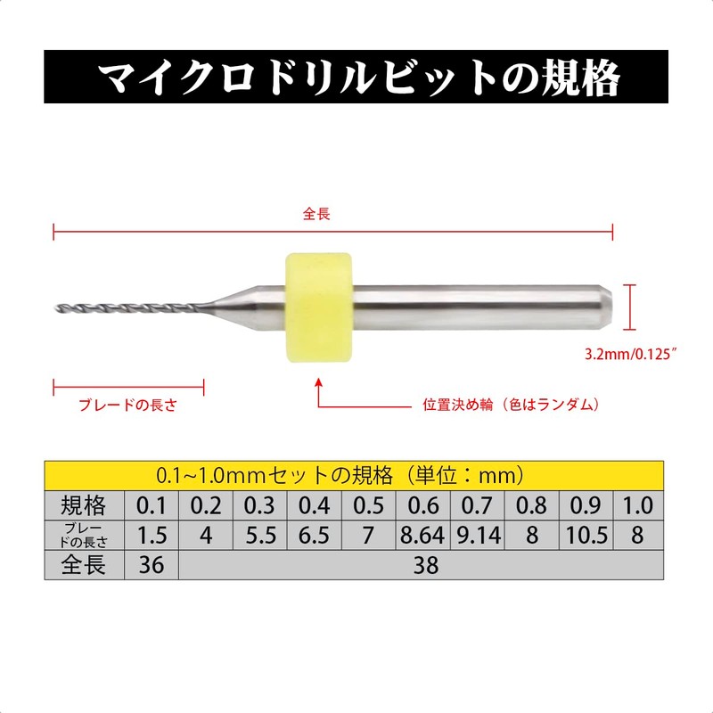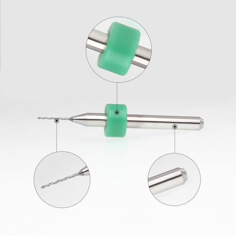 - Standards: Blade tip diameter 0.004 inch (0.1 mm), 0.01 inch (0.2 mm), 0.02 inch (0.4 mm), 0.02 inch (0.6 mm), 0.03 inch (0.8 mm), 0.04 inch (0.9 mm), 0.04 inch (1.0 mm). Shank diameter is 3.2mm. The color of the micro drill bit positioning ring is random