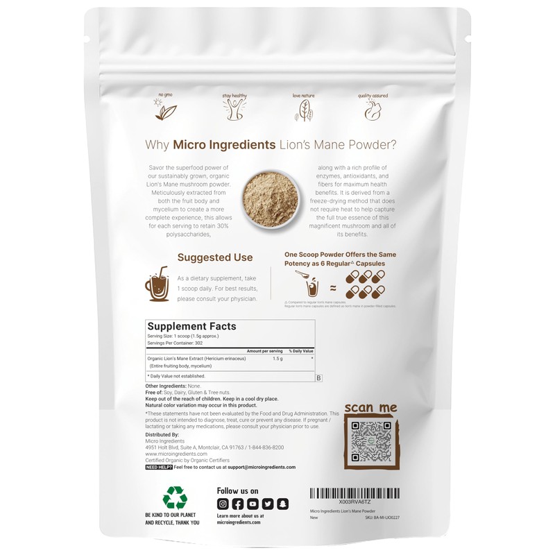 - Micro Ingredients offers high concentrated freeze-dried organic lion's mane powder, real extract from entire fruiting body and mycelium source, retains active polysaccharides.