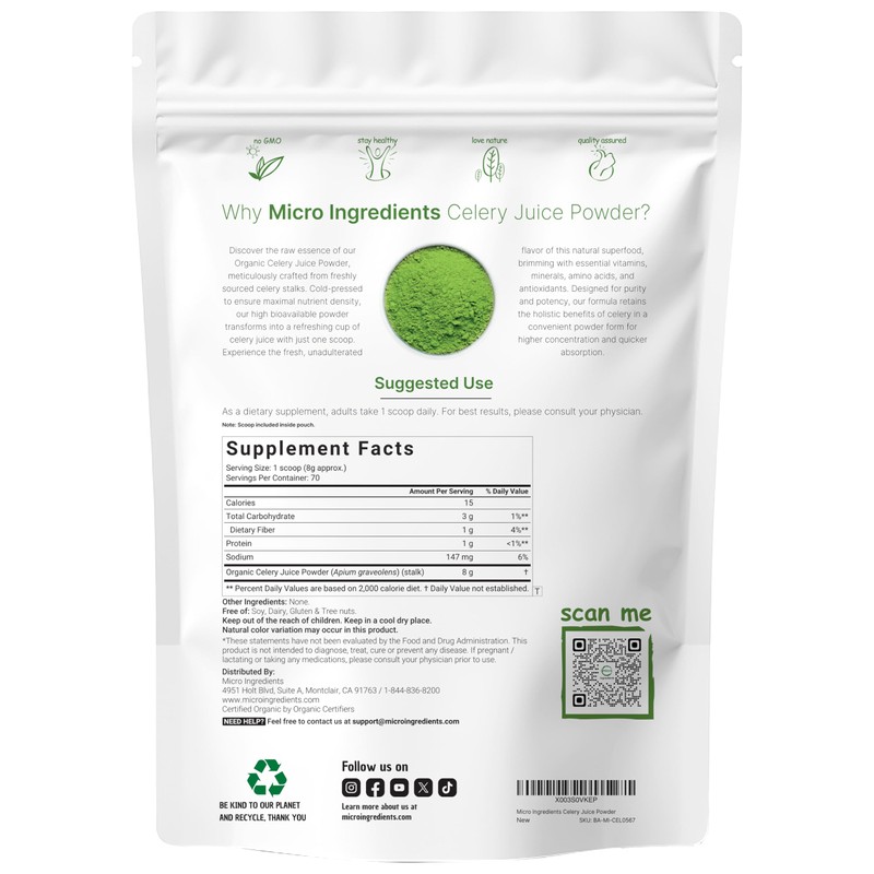 - Micro Ingredients Organic Celery Powder (Celery Juice Powder Organic), 20 Ounce (1.25 Pound), 71 Serving, Cold Pressed, Non-GMO and Vegan.