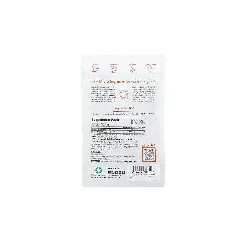 Micro Ingredients, Vitamin D3 + K2, 300 Softgels