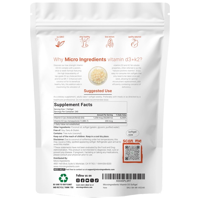 Micro Ingredients Vitamin D3 50,000 IU + K2 MK-7 200 mcg, 240 Softgels | Virgin Coconut Oil | 2-in-1 Bone, Immune & Heart Support | Easy to Swallow, Non-GMO