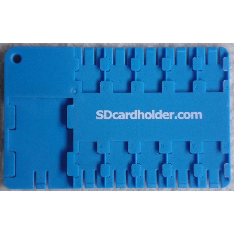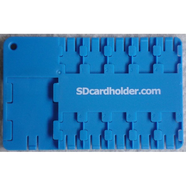 It holds up to 10 standard Micro SD cards and one standard "Micro SD to SD card adapter" The Micro SD Card Holder/Case features a positive locking feature by way of a moving independent tab for each Micro SD card that is an integral part of the single molded piece. Each sleeve has the forward right retaining tab offset to the left such that the Micro SD cards can only be fully inserted with the electrical contacts facing down and fully protected. Sized and shape of a credit card allowing it to easily be carried. Hole for keychain. SD cards and adapter not included