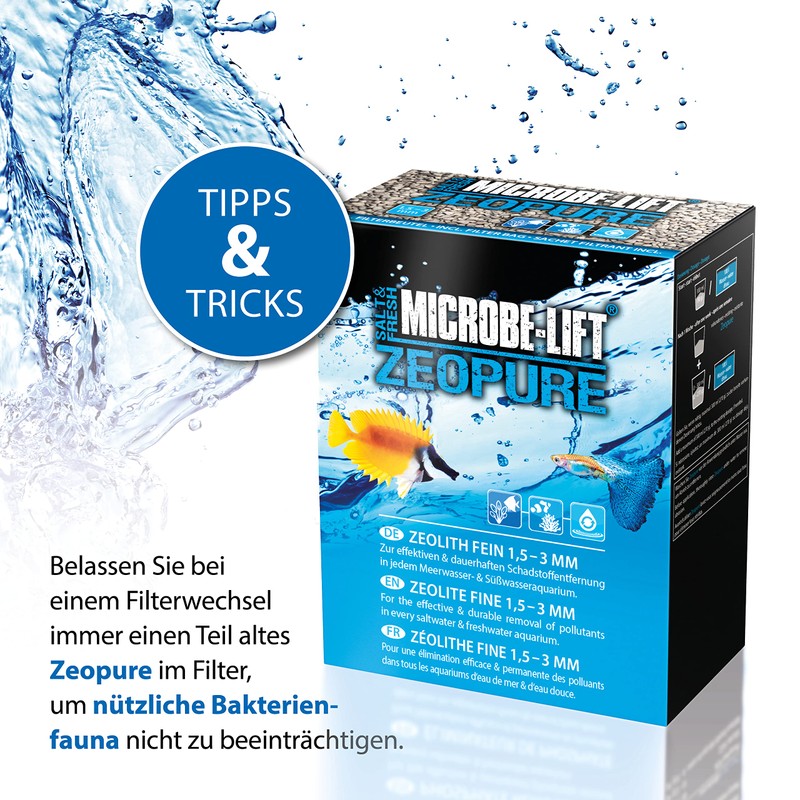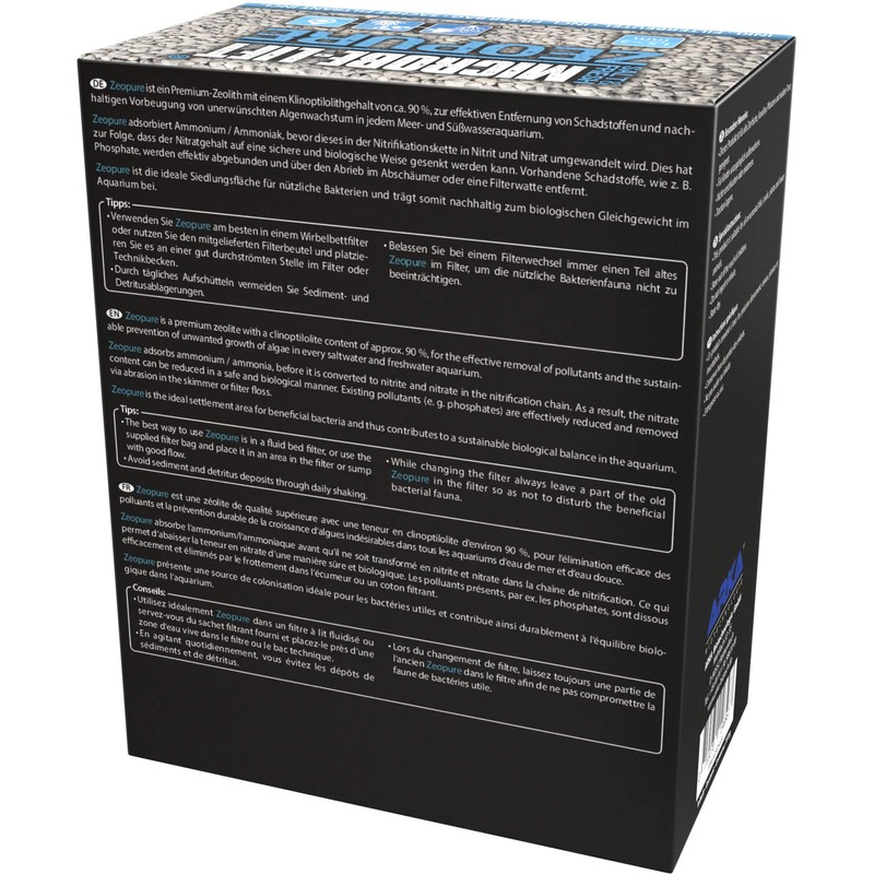 - ZEOPURE: A premium zeolite with a grain size of 1.5-3 mm and a clinoptilolite content of approx. 90%, ideal as a filter material for effective removal of pollutants and improving water quality in any saltwater and freshwater aquarium.