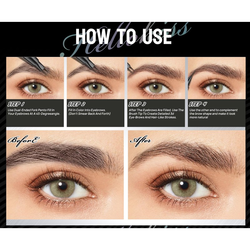 - EASY TO USE - This 2-in-1 brown eyebrow pencil allows for easy natural and full eyebrows and saves your time. Unique tips simplify the process of outlining and filling eyebrows, making it easy for even beginners to create professional-level eyebrow shapes. Use the micro fork tip to gently fill the eyebrows, outline the eyebrows, and finally use the other end to draw the tail of the eyebrows and perfect the details of the eyebrows to get vivid and natural eyebrows.