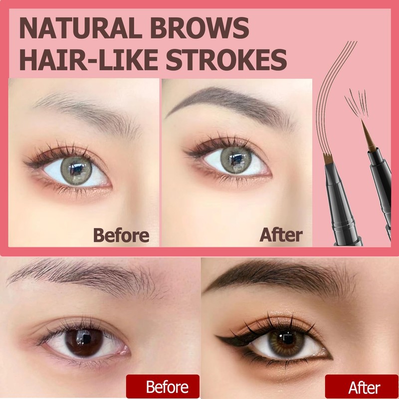 Microblading Eyebrow Pencil, Waterproof Eyebrow Pen, 2-in-1 Dual-Ended Eyebrow Pencil for Women with 4-Fork-Tip & Precise Brush-Tip, Natural Makeup Fine Stroke, Last All-Day (Dark brown)