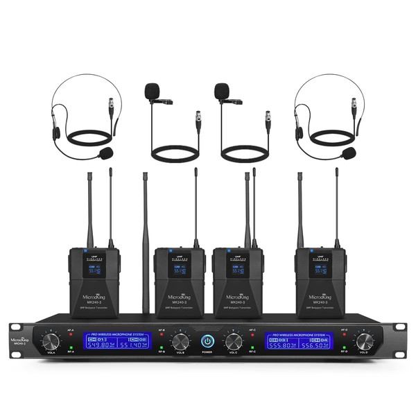 MicrocKing UHF Wireless Microphone System Cordless Lapel/Headset/Lavalier Mic(4 Bodypacks), Fixed Frequency, Long Range 400ft, Ideal for Party Church Conference Speech
