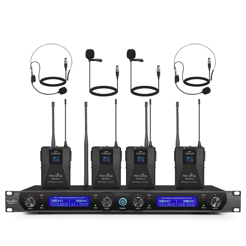 - MicrocKing 4-channel UHF wireless microphone system:fixed frequency, channel 1: 549.8Mhz. channel 2: 551.4MHz. channel 3: 555.8MHz. channel 4: 556.8MHz. total 4channels, Adaptable scenes are conference rooms, classrooms, bars, dance halls, KTV rooms and complex high-end professional music environments to achieve satisfactory results.