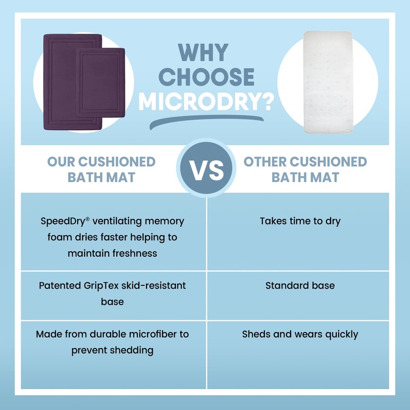 Step onto lasting comfort with the Quick Drying Memory Foam Framed Bath Mat by Microdry. Made using our SpeedDry ventilated open-cell memory foam, this mat dries 40% faster than regular memory foam bath mats helping to maintain freshness. The super-soft, ultra-absorbent microfiber top feels amazing under your feet, and our patented GripTex skid-resistant base helps keep the mat in place.