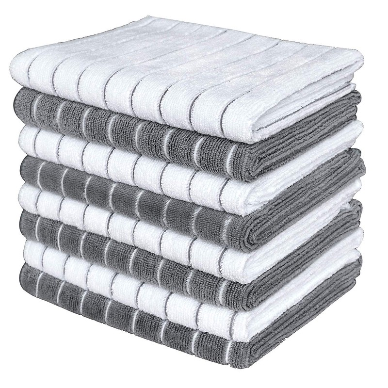 Microfiber Dish Towels - 8 Pack (Stripe Designed Gray and White Colors) - Soft, Super Absorbent and Lint Free Kitchen Towels, 26 x 18 Inch (Grey White)