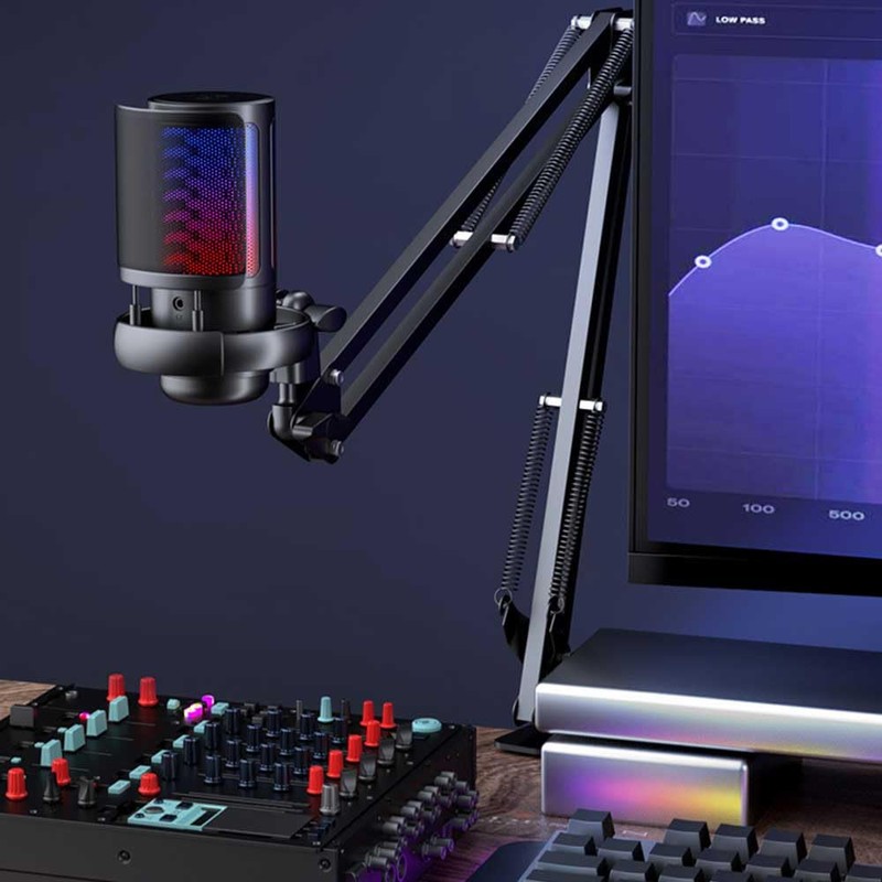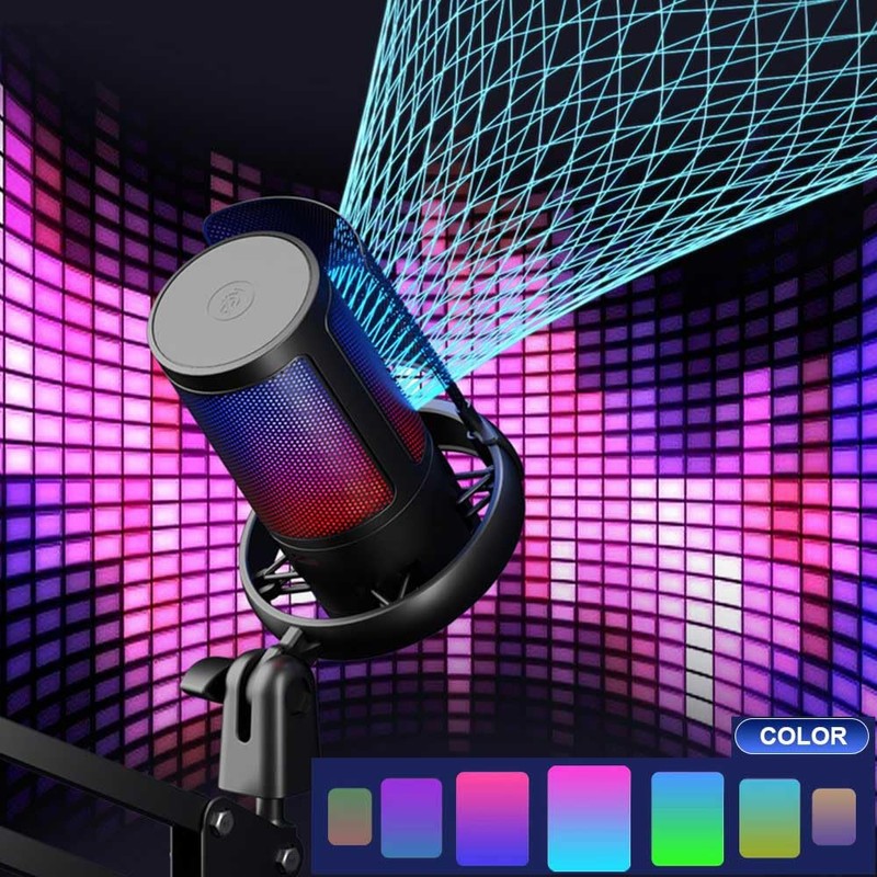 • 【COOL DYNAMIC RGB LIGHTING EFFECTS】:microfono pc cuentan tienes 3 modos RGB para elegir, incluyendo siete colores sólidos estáticos, flash lento multicolor dinámico y degradado de colores mixtos. ¡Simplemente toca el ícono de iluminación en el dispositivo, selecciona tu efecto de iluminación favorito y crea una experiencia visual impresionante! La iluminación gradiente del micrófono le trae la última sensación de inmersión de juego, creando la atmósfera de carnaval ideal.