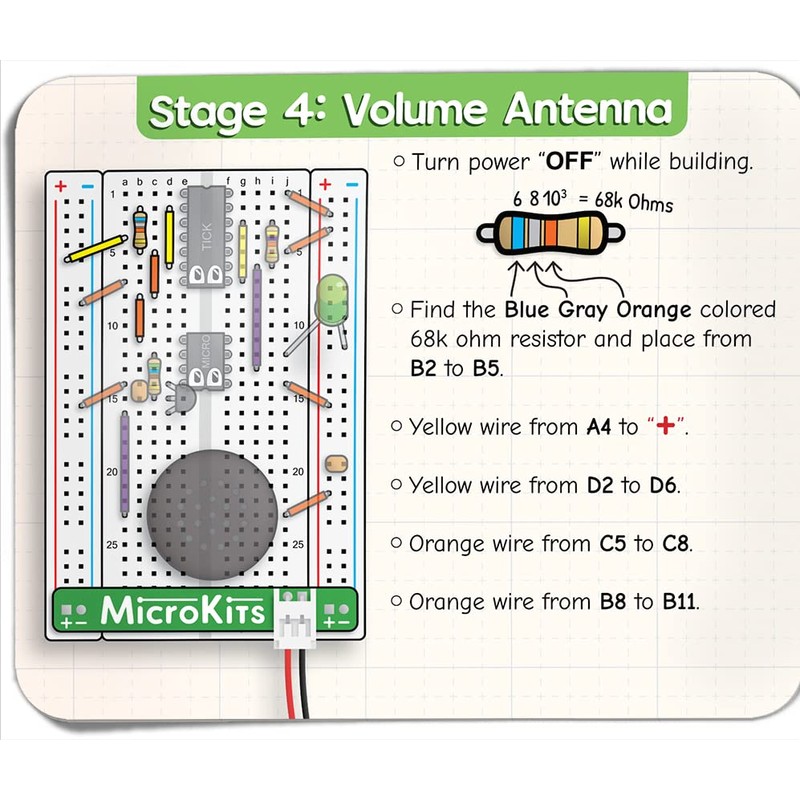 - [YOUR OWN THEREMIN] This is your chance to build your own invention. With your MicroKits theremin, you can create music and sound by waving your hands around electric fields!