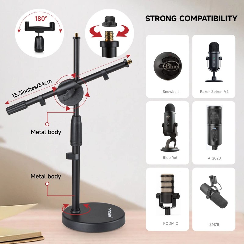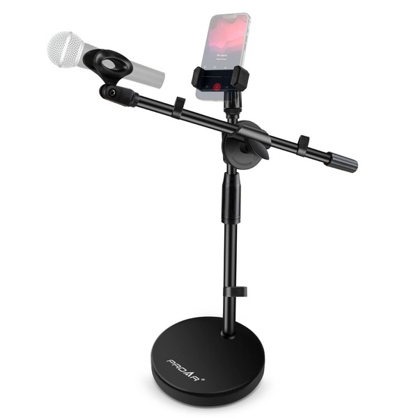 - MULTI-FUNCTION DESKTOP STAND : Upgraded microphone stand desk with boom arm has multi purposes perfect for home recording, podcasting, live streaming, broadcasts, studio, bass drums, guitar amps and video photography.The table mic stand can also be used as a cellphone stand by changing the clip.PROAR microphone stand is a versatile configuration for both beginner and professional use