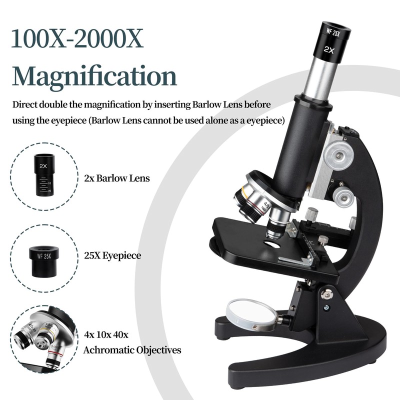 - 【High Magnification】Wide field Eyepiece WF25X and 2X Barlow lens work with 3 metal achromatic objective lenses: 4X 10X 40X, provide 100X-2000X magnification and clear images, meet all your biological observation need