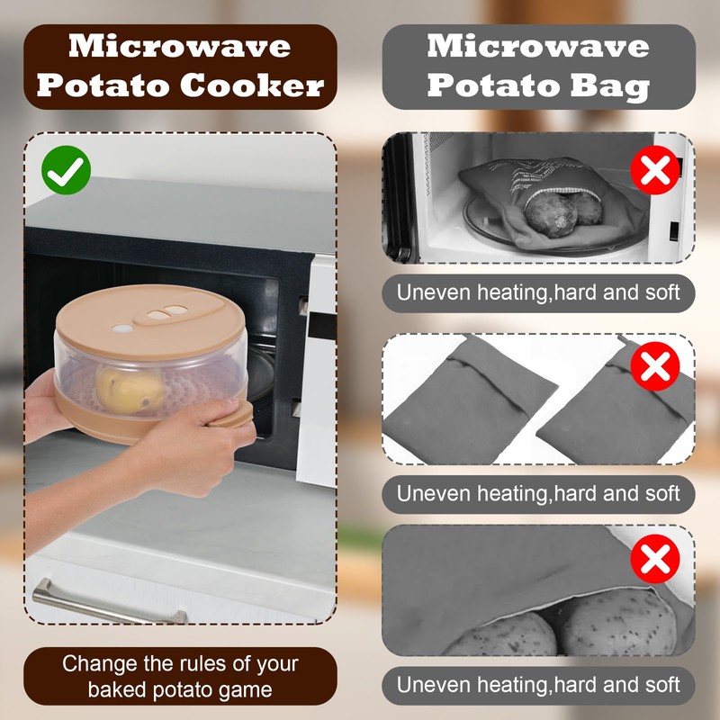 - Microwave Potato Cooker:Are you struggling with the fact that roasted potatoes directly in the oven takes too long, Baked potatoes in a baked potato microwave bag doesn't heat them evenly, Doesn't peel the skin completely, And you lose the original flavor of the baked potato? Try this game-breaking potato steamer for soft, fluffy baked potatoes in just 10 minutes, Saving you time and flavor!