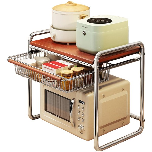 Microwave Stand 2 Tier Metal Wood Kitchen Countertop Shelf Organizer with Basket Multifunctional Microwave Oven Rack Desktop Storage Organization Rack (Middle)