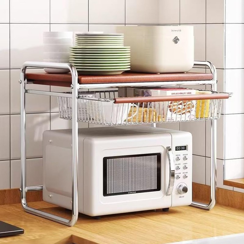 - Multifunctional Kitchen Shelf Organizer: The kitchen shelf rack makes it convenient for you to store a microwave,stove, toaster, coffee machine, pot pans or other kitchen appliance, making your kitchen clean and tidy and with a a pull-out drawer basket, which is convenient for you to store knives, forks, bowls, chopsticks, seasonings and other kitchen scraps, etc