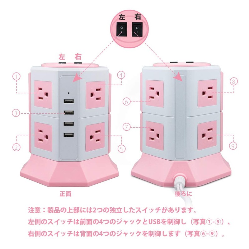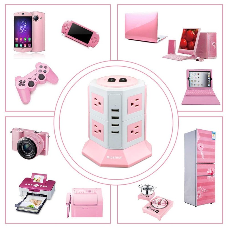 Micshion Power Strip Tower Outlet, 2 Bipolar Switches AC 8 USB 4 Ports (4.5A/5V) 1500w Input 100v-125v Fast Charging Lightning Guard Protection Overload Protection Extension Cord 2m for Office Home Pink