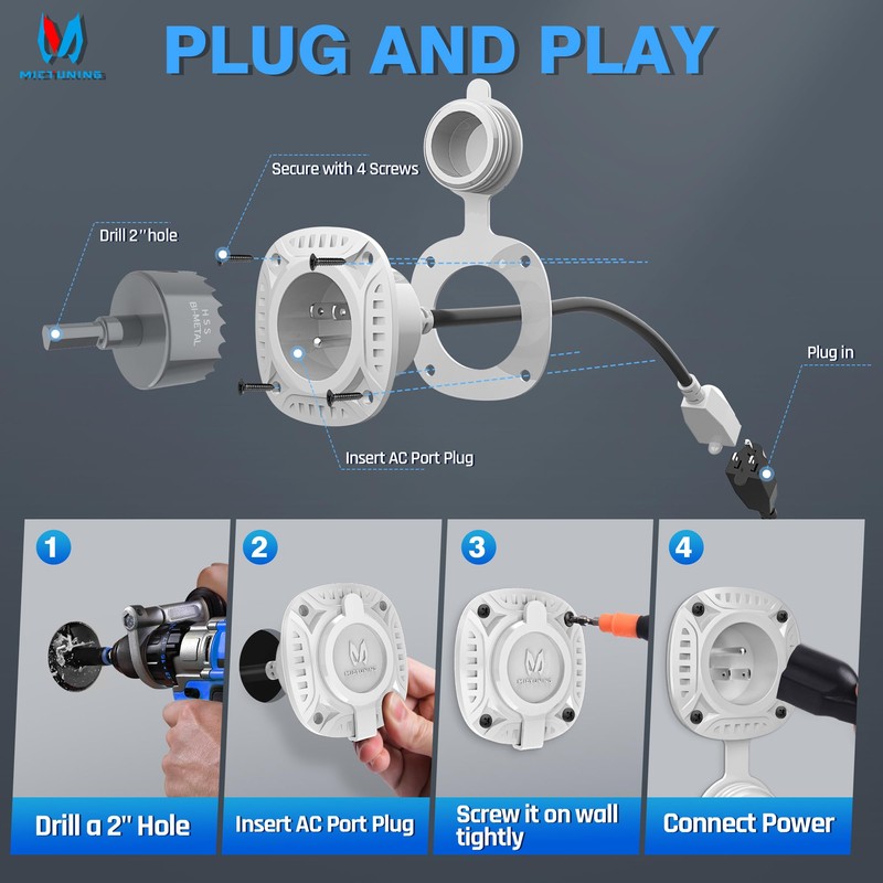 - EASY INSTALLATION No additional manual wiring or modification of cable required, just a 2 inch drill hole, just flush mounted with 4 screws for a neat appearance of the manufacturer. WHAT YOU GET: 2 years MICTUNING warranty and lifetime customer service, 1 AC power connector plug, 4 screws.