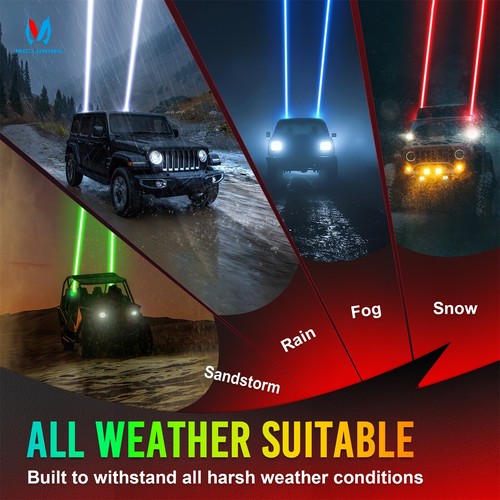 • MICTUNING laser whip lights emit 40W of total power and 1200 lumens, providing an extremely focused spot beam that shines up to 1900 feet, enhancing both style and safety. Choose from four colors: Red, Green, Blue, and White. The whipless design eliminates worries about breakage or snapping. The CNC-machined aluminum housing ensures fast heat dissipation, while the real glass lens with a PC cover guarantees long-lasting and reliable performance. With an IP68 rating, these lights are waterproof, dustproof, and shockproof, making them resistant to water, snow, sand, and other harsh conditions.