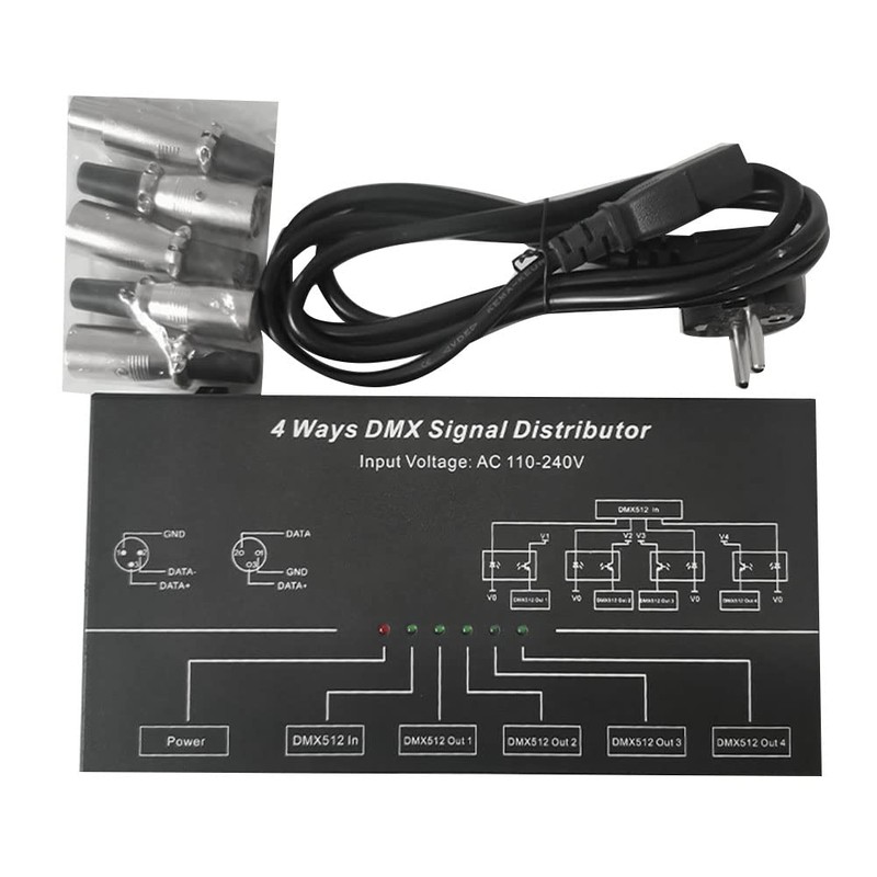 - For shaping amplification and 4-way distribution output, each input and output interface adopts photoelectric high-voltage isolation technology, which is suitable for DMX512 signal processing.