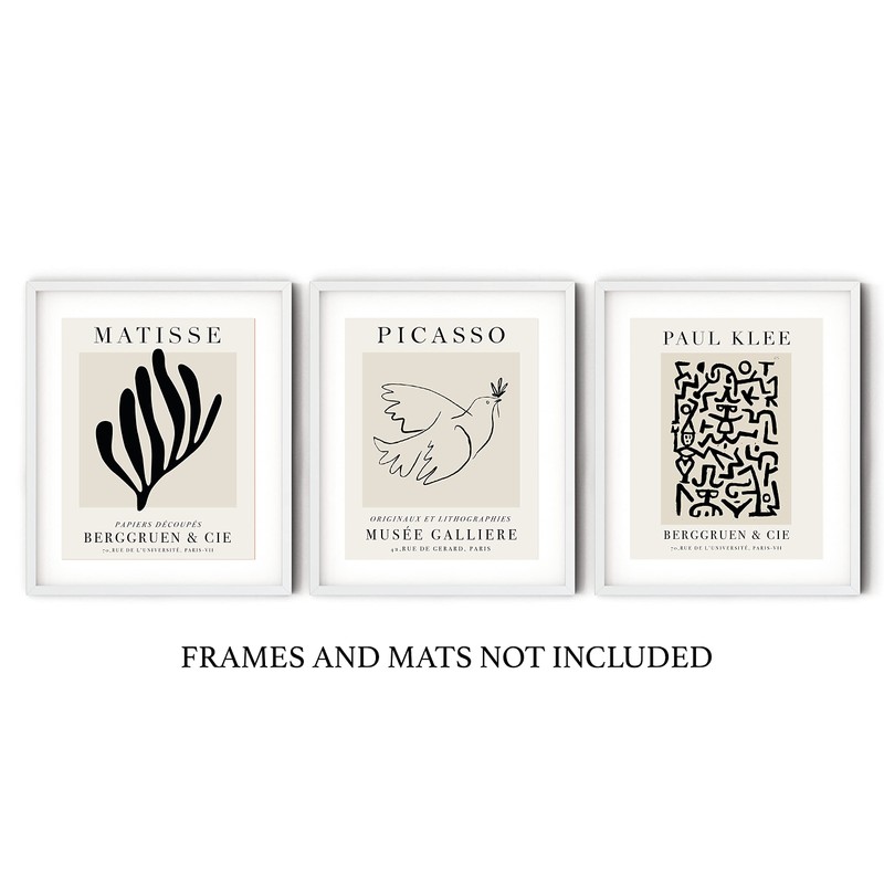 Mid-Century Artists Klee Matisse Picasso Inspired Exhibition Poster Print Set | Set of Three 11x14 UNFRAMED | Beige, Tan, Black Neutral Abstract, Minimalist Modern Wall Decor