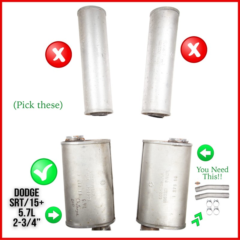 mprove your vehicles airflow with mandrel bent exhaust components from Khaos Motorsports! A mandrel is placed inside the pipe as it is clamped and pulled around a die. This ensures that there is no loss to air flow. Better airflow means improved gas mileage and more horsepower! You can feel that Hemi power, but you can't hear it! Tired of the Mustang pulling up next to you and reving it up, while you've got nothing? Have no fear the answer is here! We've put together a kit to give your car some bark! Dodge decided to put 6 mufflers on these cars, now it's time to get rid of 2. This is a inexpensive way to let your beast be heard! This listing is for 2 mandrel bent pipes and clamps to replace your mid mufflers. Just cut out that suitcase and clamp these in. The great thing about deleting the mid mufflers is there is very little drone inside the vehicle. Be sure to check with us often as we will be soon offering other kits for your Hemi powered vehicle. Made in the USA This part fits Dodge vehicles 2008-2021 equipped with 2.75" exhaust and Oval Mufflers found most commonly on SRT, Scatpack, and newer 5.7L