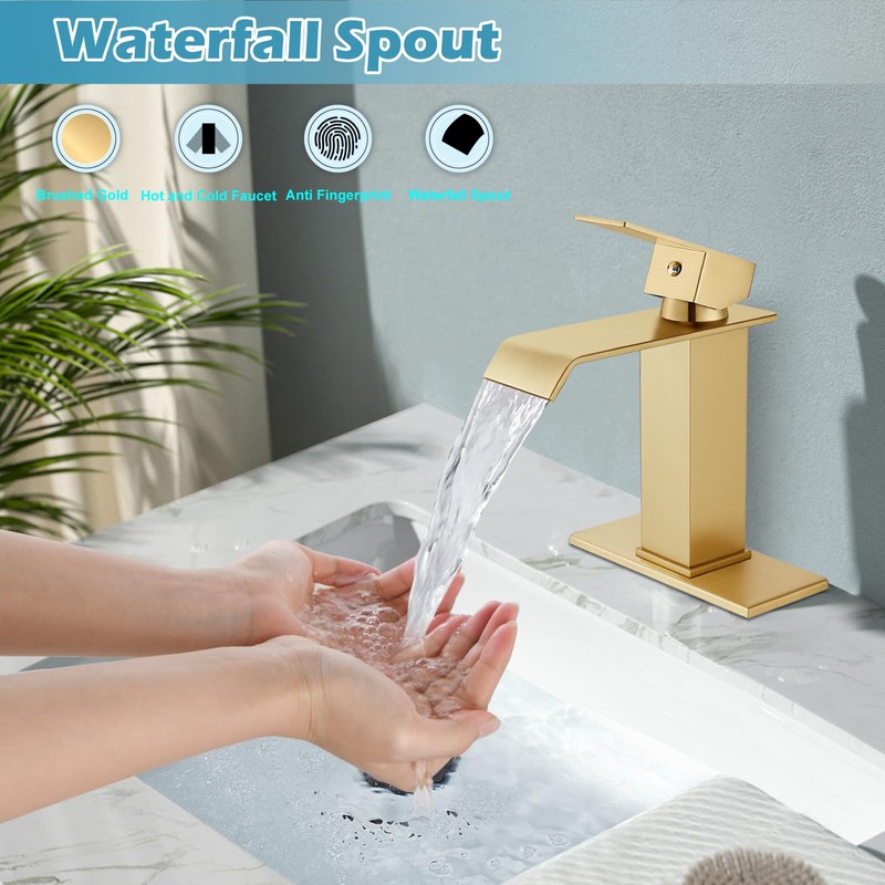 - 【Design】:The ultra-wide waterfall spout design make large water flow. Brushed gold finish resist corrosion and can prevent tarnishing, highly reflective.