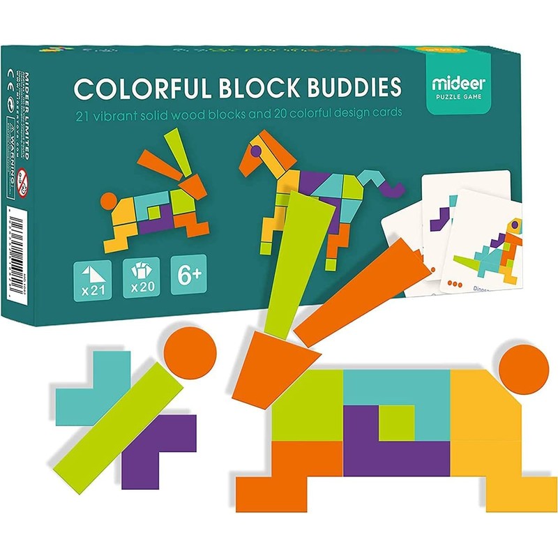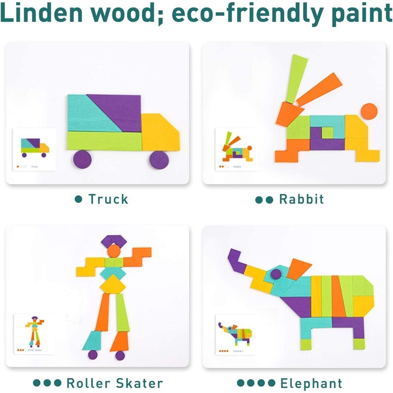 MiDeer Wooden Geometric Imagination Puzzle with 21 Wood Blocks and 20 Pattern Cards Educational Learning Game for Kids
