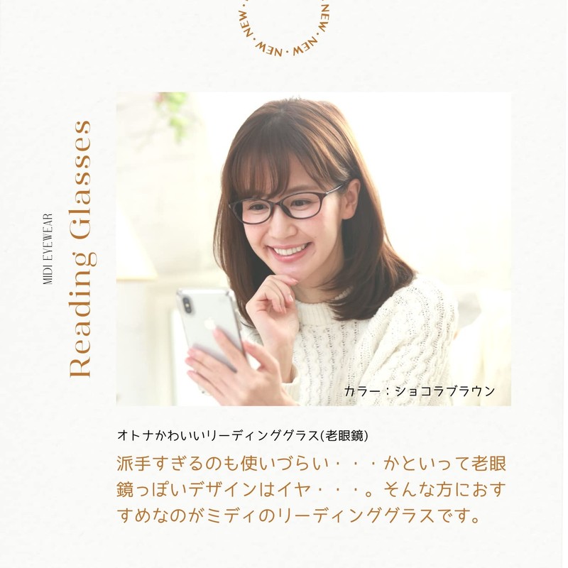 - 【MIDI ミディ】「リーディンググラスをもっと楽しく・快適に」をコンセプトに生まれたアイウェアブランド"MIDI(ミディ)"。このフレームは、普段使いからお出かけまで幅広いシーンに合わせやすい小ぶりなオーバルスタイル(横に長い楕円形のフレーム)です。