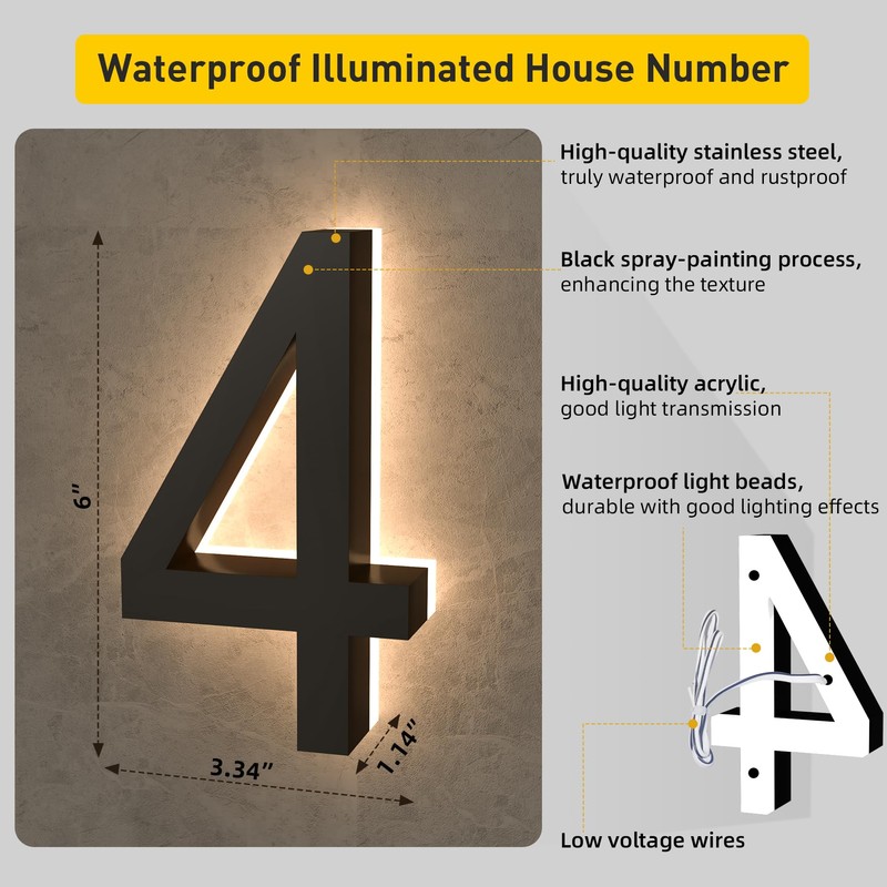 • 🛡️Built to Last - Lighted house numbers crafted with precision, house numbers are a synergy of high-quality stainless steel and translucent acrylic. These materials aren't just for show, they come with the assurance of being waterproof and rustproof, standing strong against the harshest weather conditions. Lamp life exceeds 50,000 hours.