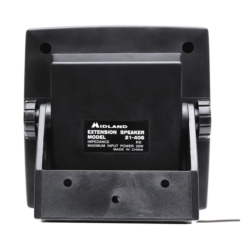 The Midland 21-406 is a high performance 8-ohm extension speaker. The 20-Watt extension speaker can be used with CB or Marine Radios with a 3.5mm speaker output. The bracket size is 3.25" x 1.25". It features a swivel base and includes a cable with a 3.5mm plug.