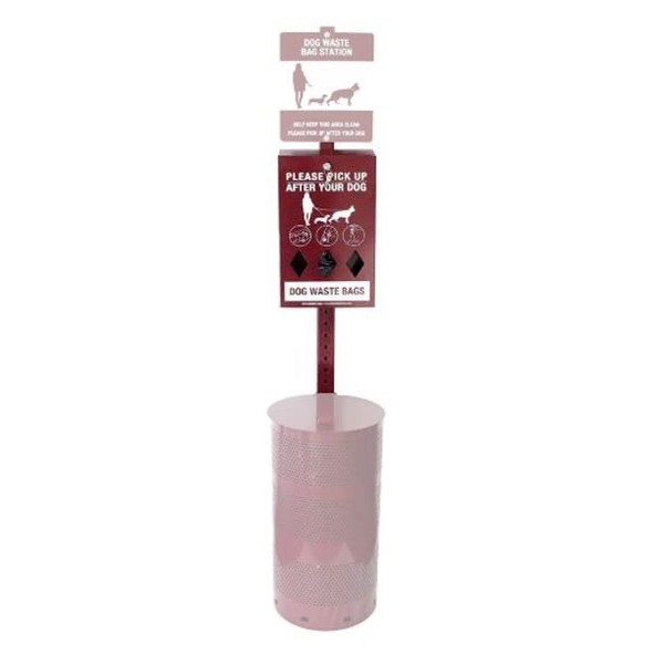 - Comes with pole and bag holder/dispenser only. Garbage can and sign sold separately.