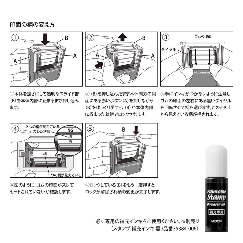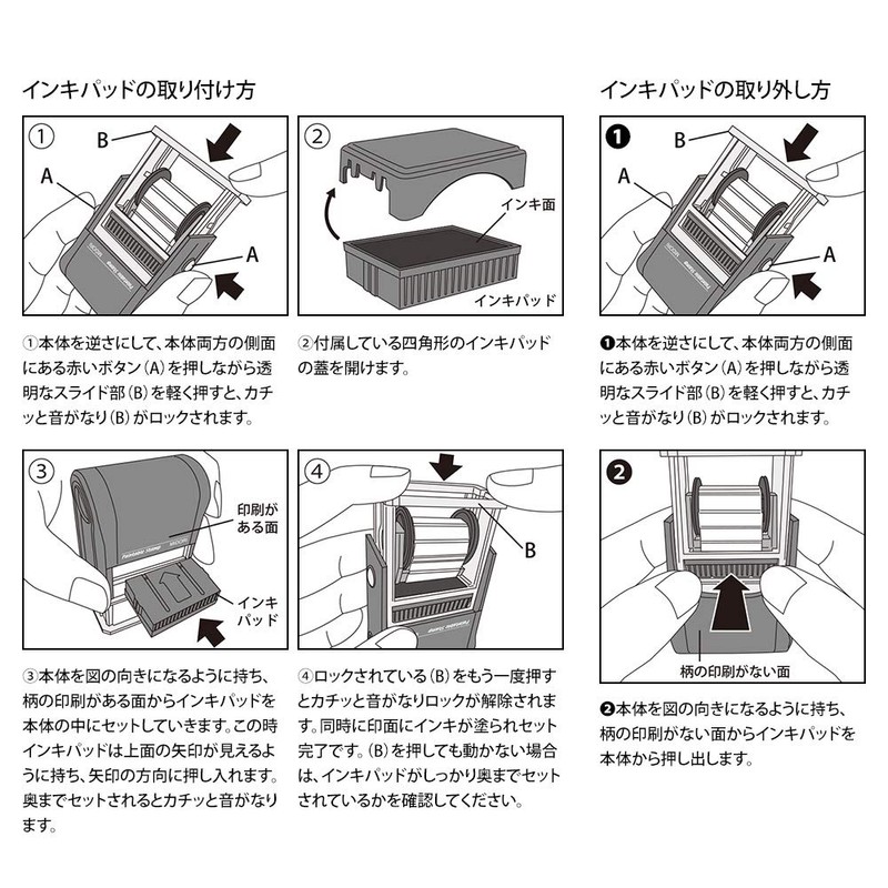 - Materials: Main unit: ABS, POM, polycarbonate, steel spring, Stamp surface: Rubber, Ink pad: Oil-based pigmentary black ink: ABS + Urethane