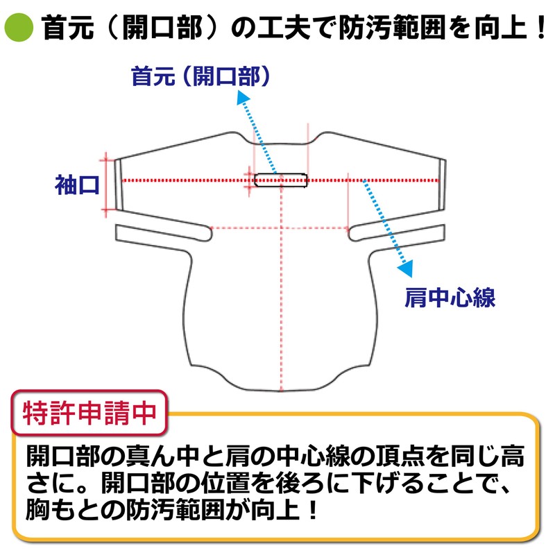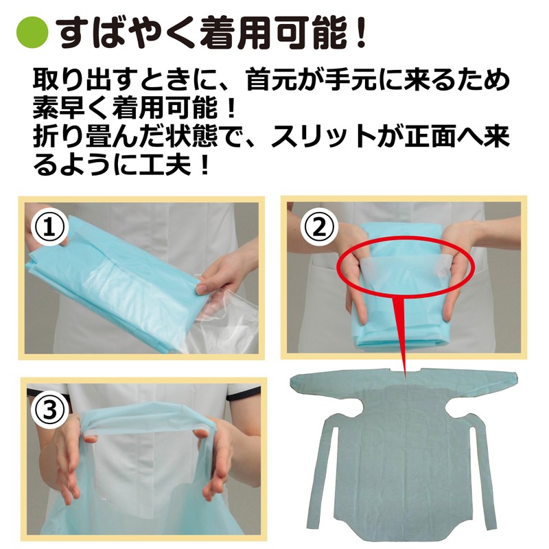 Ideal for preventing infections from contact infections and splashing infections. Can also be used for nursing, nursing, and assistance such as diapers and waste processing - The neck (opening) improves the dirt-prevention area. >>> Center of the opening and the top of the shoulder at the same height. By lowering the position of the opening backward, the area of the chest area has been improved. <