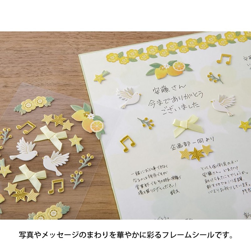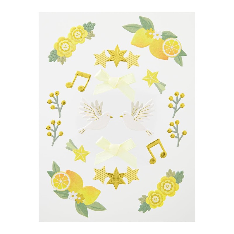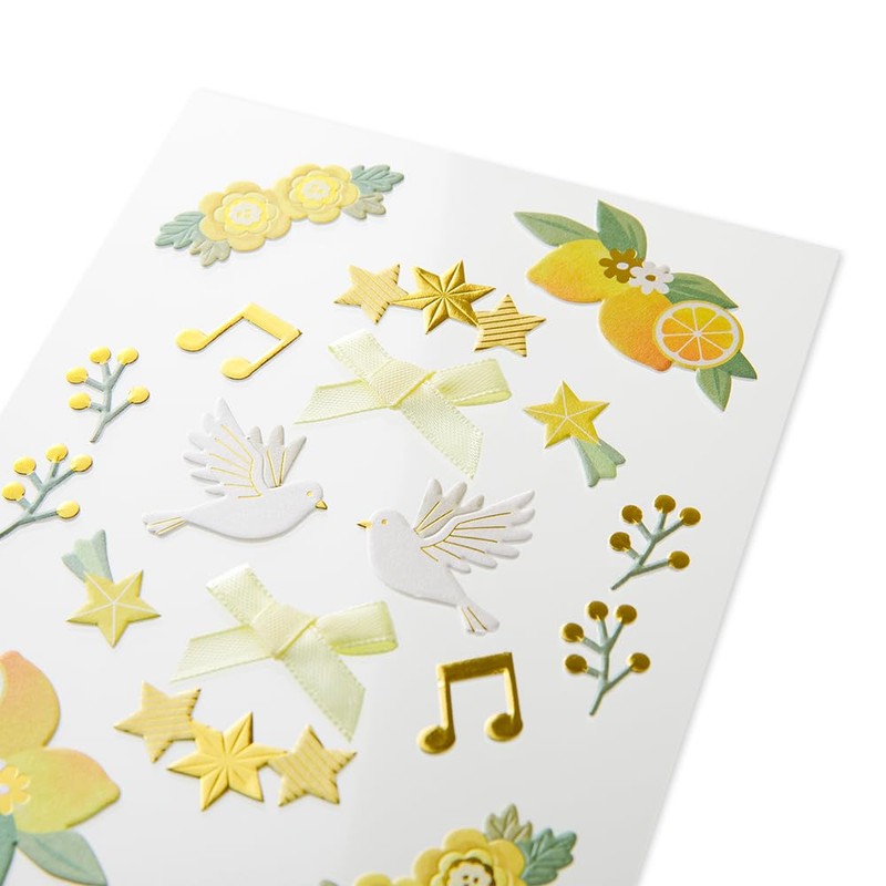 • The design of birds, lemons, and glittering stars create a bright and happy atmosphere
