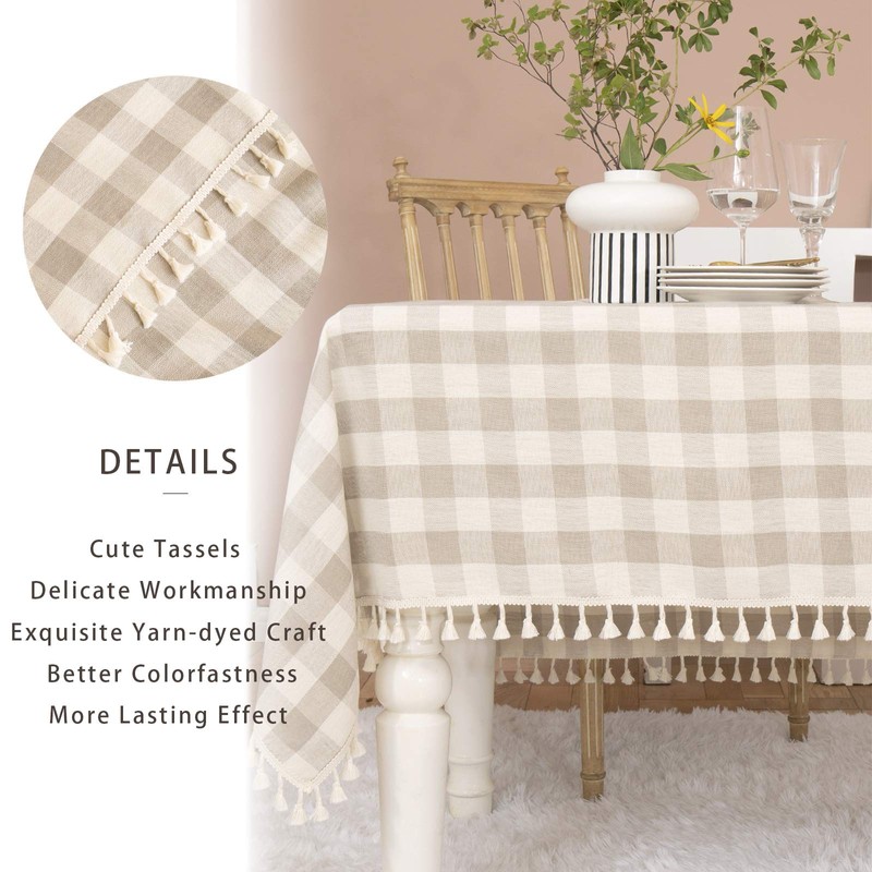 - * #1, DESIGN OF THE CHECKERED RECTANGLE TABLECLOTH # Features the classic buffalo check pattern in gary,khaki and white to create the best farmhouse look, edged in jaunty tassels for a refined finish and playful touch to your decor! Rustic in appearance that suits farmhouse, rustic, or modern decor styles, and will instantly lift the mood of anyone who comes to eat with you.