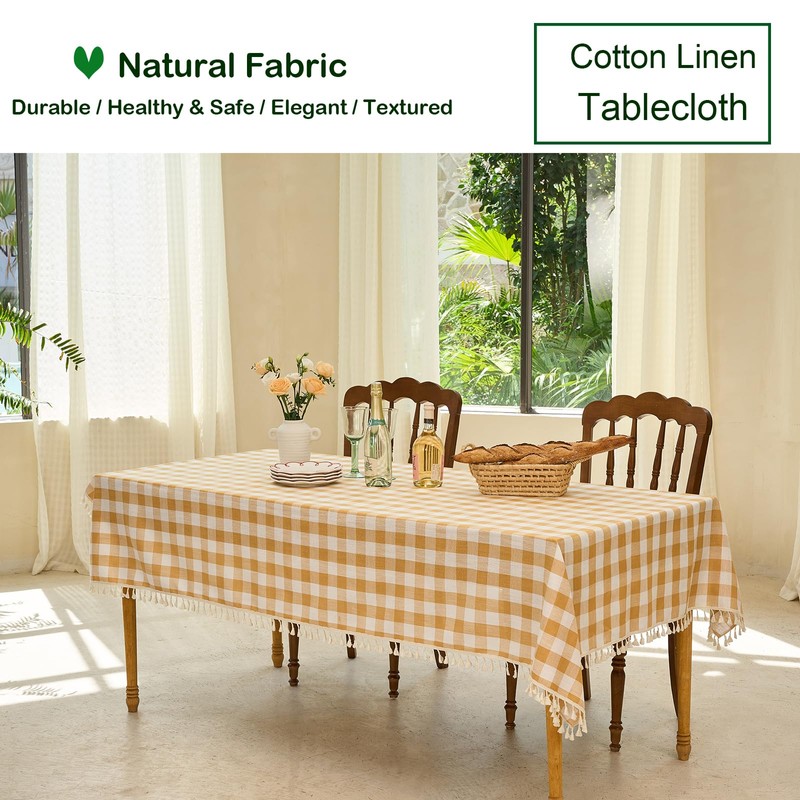 - CLASSIC CHECKERED SQUARE TABLECLOTH - Features the classic buffalo check pattern in yellow and white to create the best farmhouse look, edged in jaunty tassels for a refined finish and playful touch to your decor! Rustic in appearance that suits farmhouse or modern decor styles, it is very easy to create a coordinated look for your dinner party and yet is practical for everyday family meals.